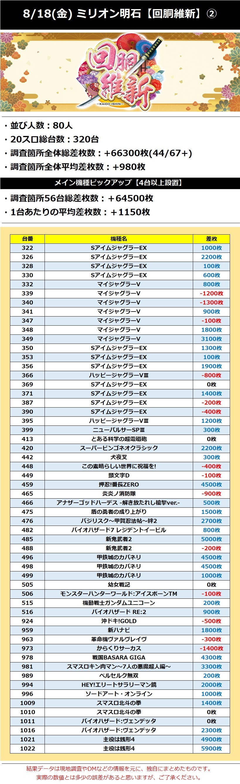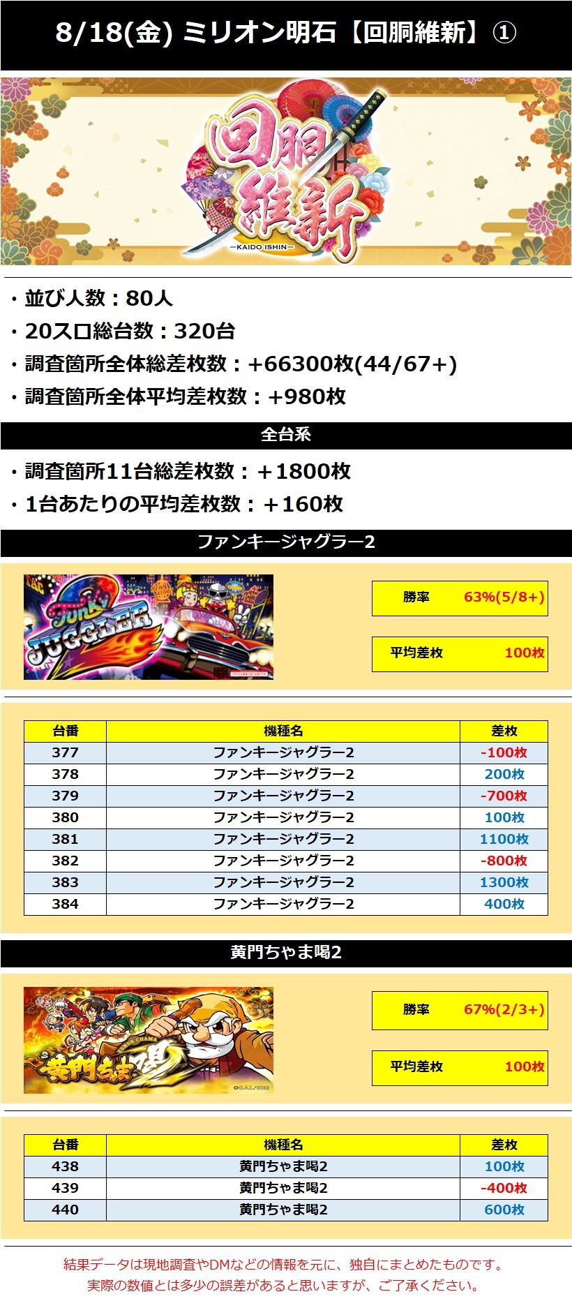 ミリオン明石 8/18(金)【回胴維新】 2023年08月19日 12:00 「ミリオン明石」カテゴリの最新記事 「回胴維新」カテゴリの最新記事 < 前の記事次の記事 > コメント コメントフォーム 名前 コメント 記事の評価 リセット リセット 顔 星 情報を記憶 コメントを投稿する