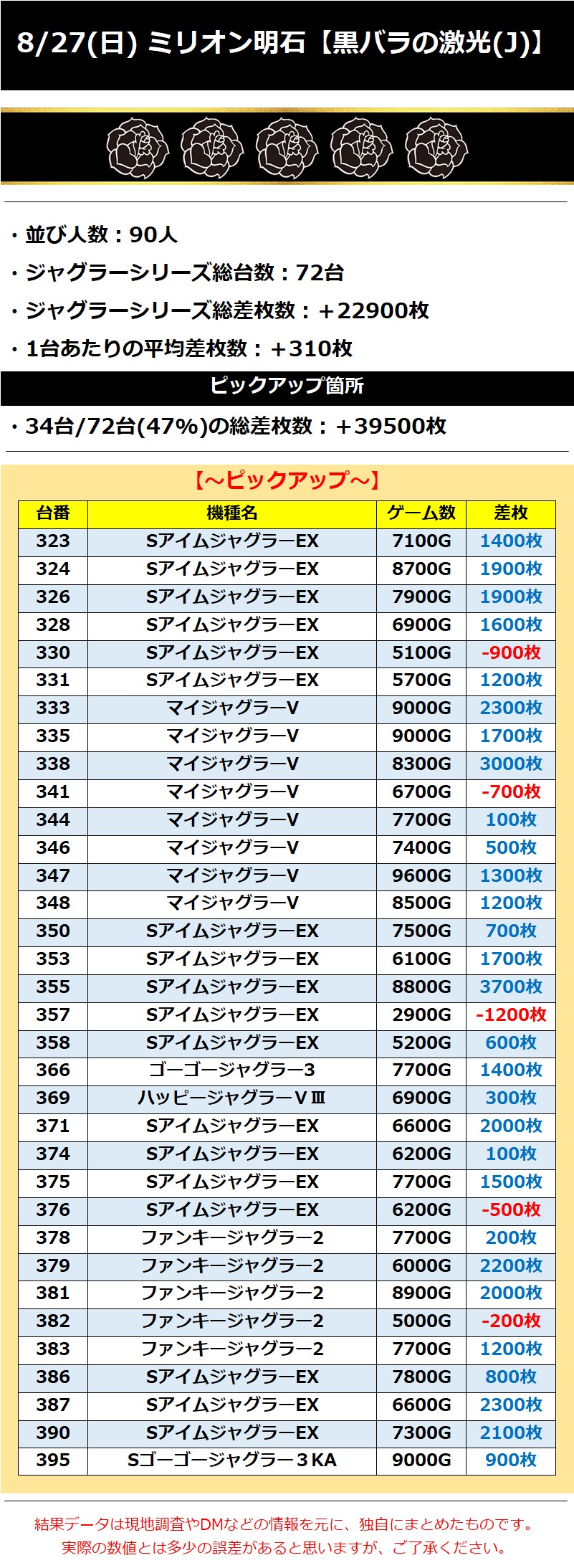 【★5】ミリオン明石 8/27(日)【黒バラの激光(J)】 2023年08月28日 12:00 「ミリオン明石」カテゴリの最新記事 「黒バラの激光」カテゴリの最新記事 < 前の記事次の記事 > コメント コメントフォーム 名前 コメント 記事の評価 リセット リセット 顔 星 情報を記憶 コメントを投稿する