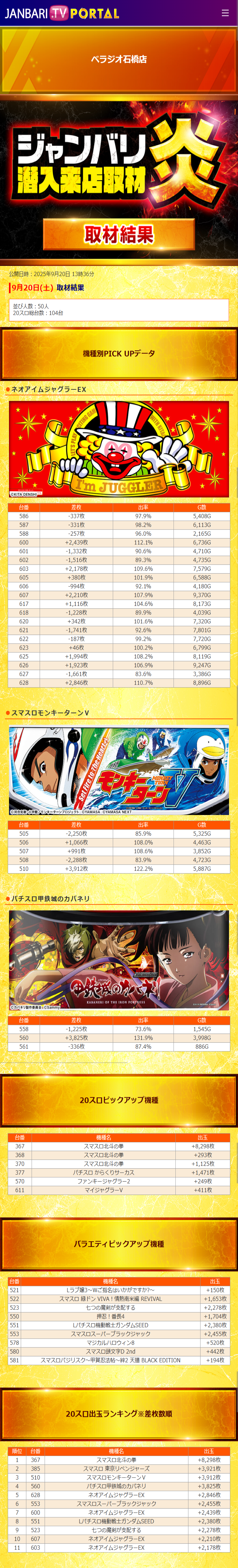 ベラジオ石橋 9/20(土)【ジャンバリ潜入来店取材炎】 2025年09月21日 12:00 引用元:ジャンバリ潜入来店取材 「べラジオ石橋」カテゴリの最新記事 「ジャンバリ潜入来店取材」カテゴリの最新記事 < 前の記事次の記事 > コメント コメントフォーム 名前 コメント 記事の評価 リセット リセット 顔 星 情報を記憶 コメントを投稿する