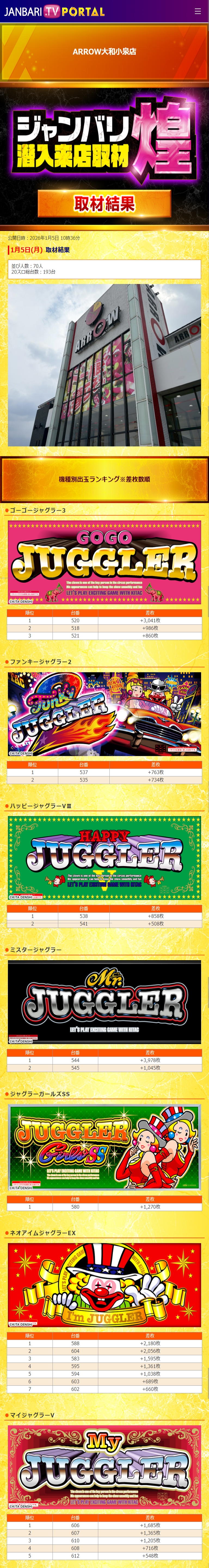 アロー大和小泉 1/5(月)【ジャンバリ潜入来店取材煌】 2026年01月06日 12:00 引用元:ジャンバリ潜入来店取材 「アロー大和小泉」カテゴリの最新記事 「ジャンバリ潜入来店取材」カテゴリの最新記事 < 前の記事次の記事 > コメント コメントフォーム 名前 コメント 記事の評価 リセット リセット 顔 星 情報を記憶 コメントを投稿する