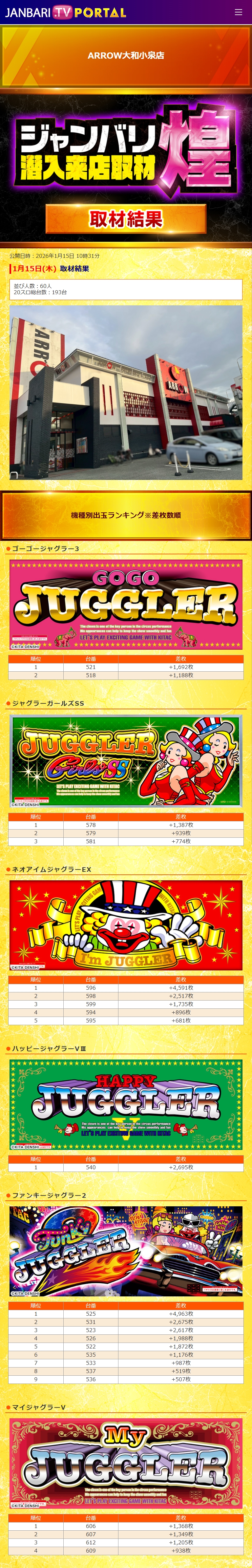 アロー大和小泉 1/15(木)【ジャンバリ潜入来店取材煌】 2026年01月16日 12:00 引用元:ジャンバリ潜入来店取材 「アロー大和小泉」カテゴリの最新記事 「ジャンバリ潜入来店取材」カテゴリの最新記事 < 前の記事次の記事 > コメント コメントフォーム 名前 コメント 記事の評価 リセット リセット 顔 星 情報を記憶 コメントを投稿する