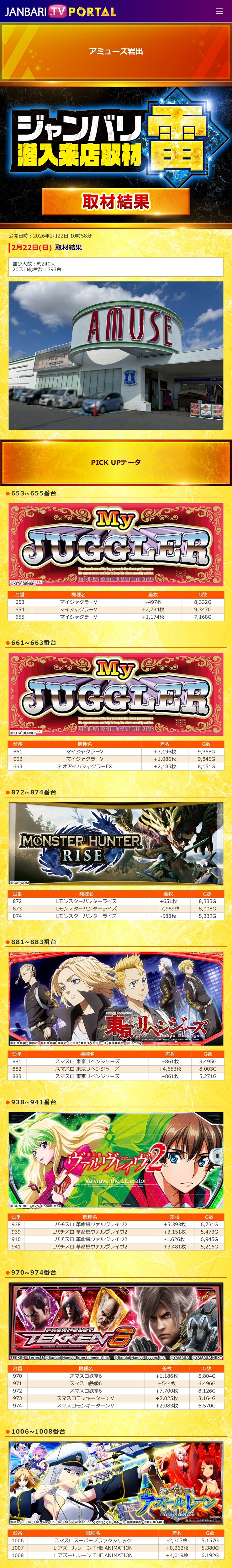 アミューズ岩出 2/22(日)【ジャンバリ潜入来店取材雷】 2026年02月23日 12:00 引用元:ジャンバリ潜入来店取材 「【関西➀】店舗」カテゴリの最新記事 「ジャンバリ潜入来店取材」カテゴリの最新記事 < 前の記事次の記事 > コメント コメントフォーム 名前 コメント 記事の評価 リセット リセット 顔 星 情報を記憶 コメントを投稿する